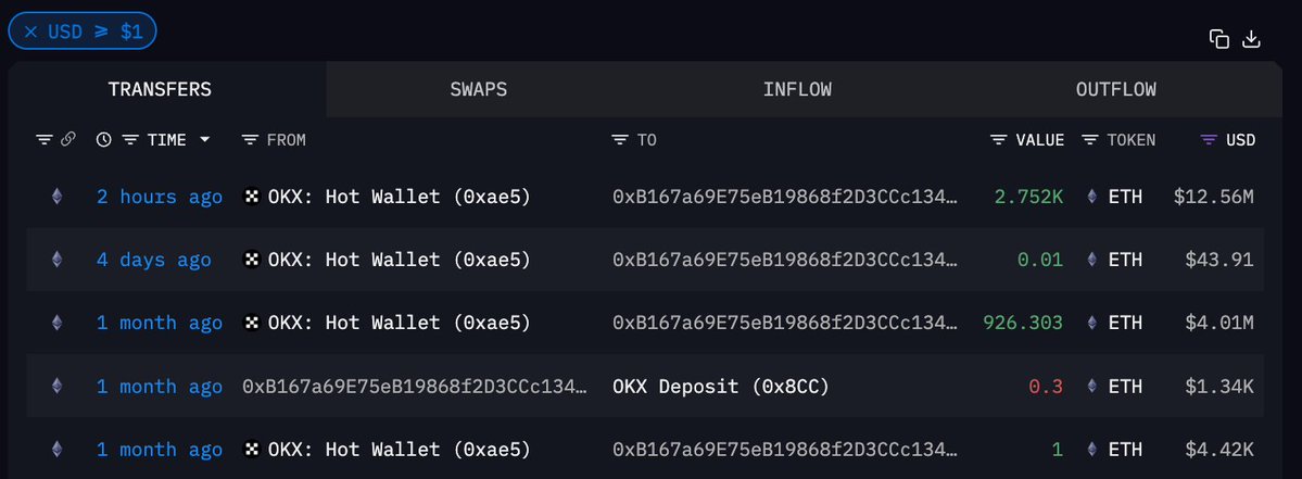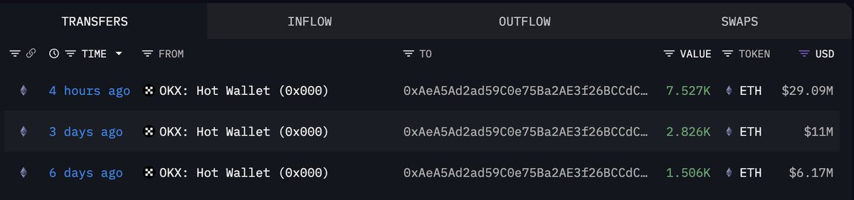 07.14 - 08.04 期间他曾以 $3457 从 #Kraken 提出 13600 ETH(约 4701 万美元),这也是该地址近两年来首次从交易所提出 ETH 而非卖掉,后续 08.18 - 08.28 他以均价 $4152 在链上卖掉了 5300 枚,通过波段获利 368 万美元