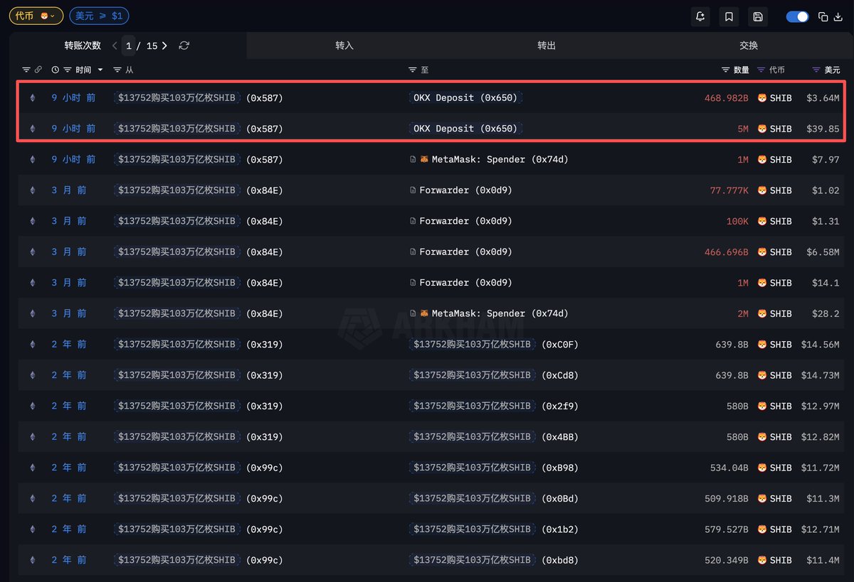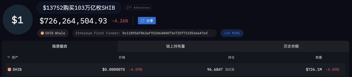 他的剩余持仓:96.22 万亿枚 $SHIB ($7.18 亿),为 SHIB 总量的 16.3%。
