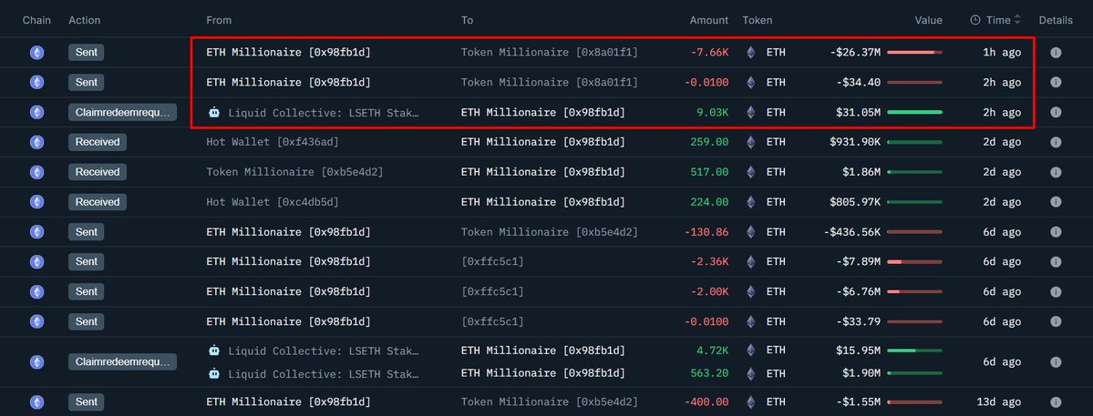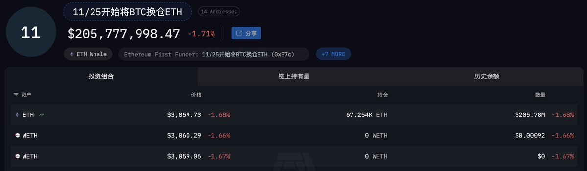 2025 年以来已累计卖出 30300 ETH,总价值 9936 万美元,平均卖出价格 $3279,目前链上仍持有 97750 ETH(3.91 亿美元);钱包地址