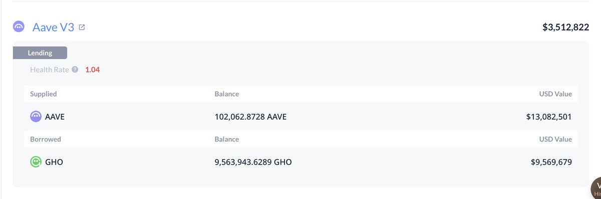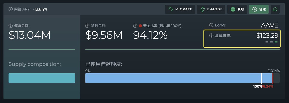 $AAVE 要是再跌 $7 刀 (到 $123),一个使用杠杆投资 $AAVE 的鲸鱼,他 10.2 万枚 AAVE ($13.08M) 仓位就将迎来清算。 他是在去年 10-12 月通过循环贷方式从 Aave 借款了 956 万 GHO 购买 AAVE,成本均价在 $166。 他是真的有够钻石手:他的 AAVE 从买入到去年底时最高浮盈 $2133 万、又从大幅浮盈跌到现在浮亏 $358 万即将清算。他都从未卖出。