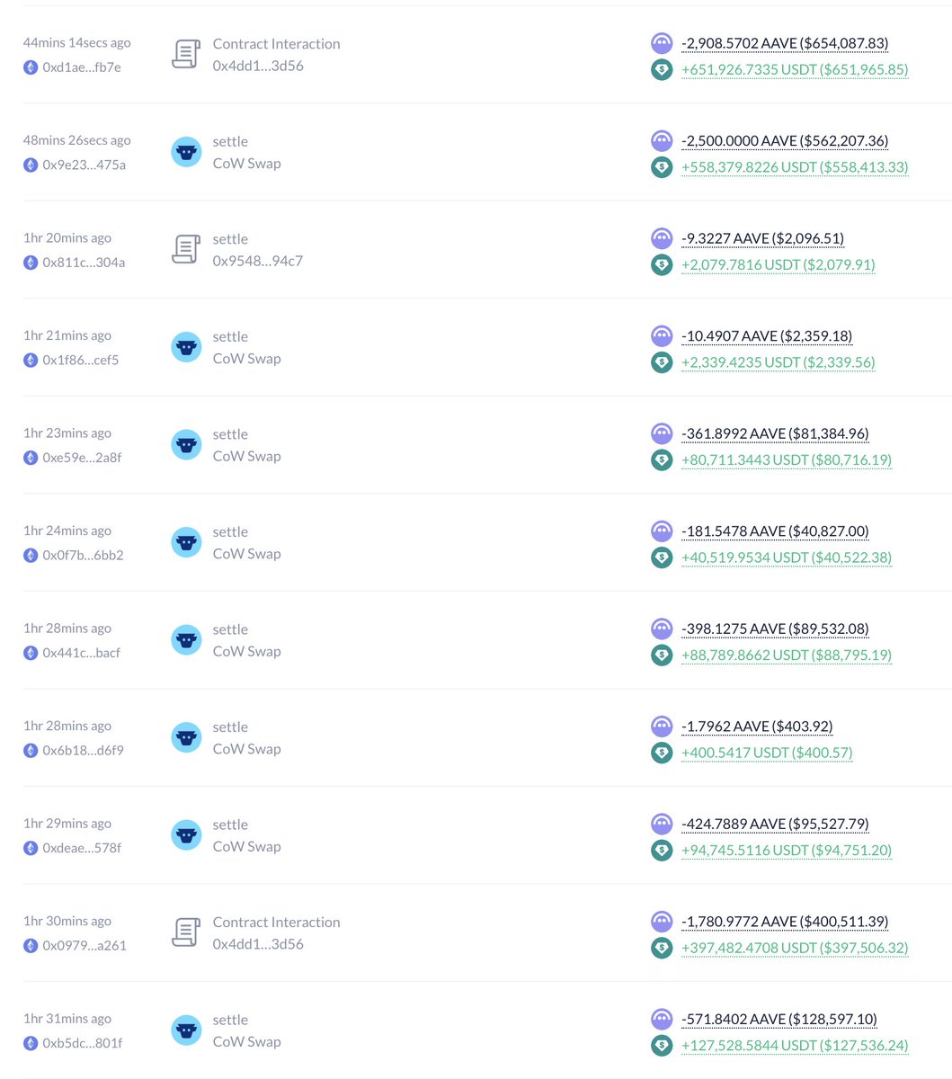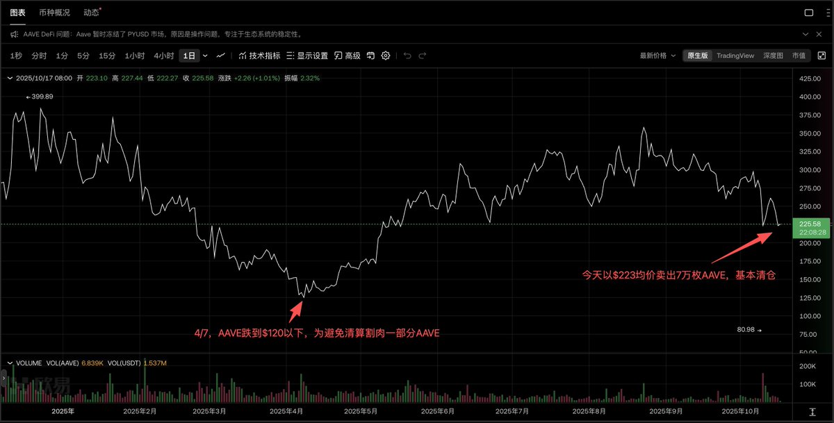 之前在 4 月份 AAVE 跌到 $120 以下时险些被清算掉的循环贷做多 AAVE 鲸鱼,今天选择卖出了 7 万枚 AAVE ($1562 万) 还清全部借款卸掉杠杆。 ◎他在过去 4 个小时里,从 Aave 取回 7 万枚 AAVE 以 $223 的均价卖出换成 1562 万 USDC,然后还清了在 Aave 上的借款。 ◎在还清借款后,他持有的 AAVE 只剩余 2.1 万枚 ($480 万)。 ◎4 月份的时候,他为了这个 AAVE 仓位不被清算掉,还在 $120 左右割肉了一部分 AAVE。