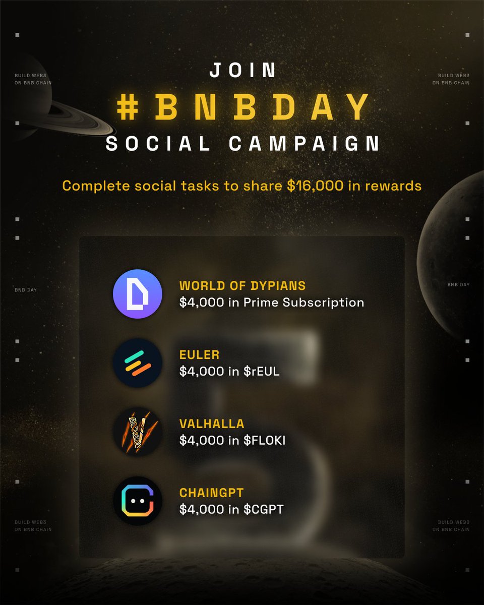 1️⃣ 关注@BNBCHAIN、@worldofdypians、@eulerfinance、@ValhallaP2E和@Chain_GPT。