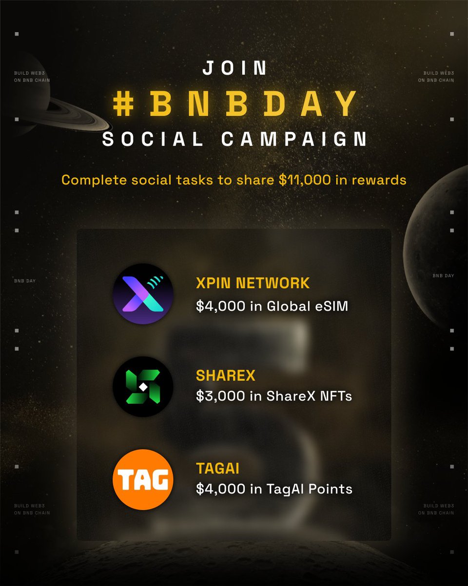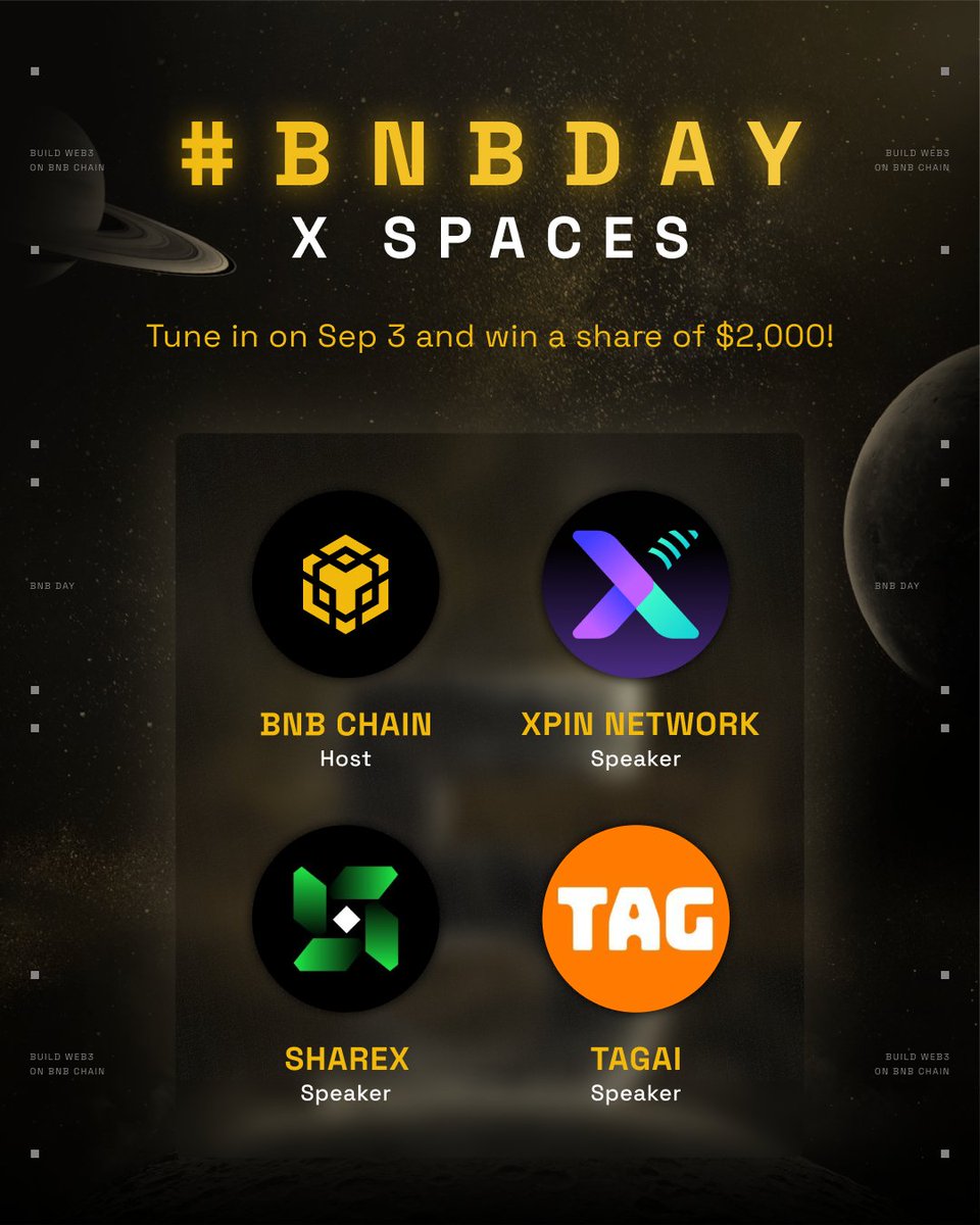加入我们一小时的#BNBDay X Space特别活动,与@XPINNetwork、@ShareX_Network和@TagAIDAO一起!🎙️ 参与下面的挑战,赢得$2,000的份额👇