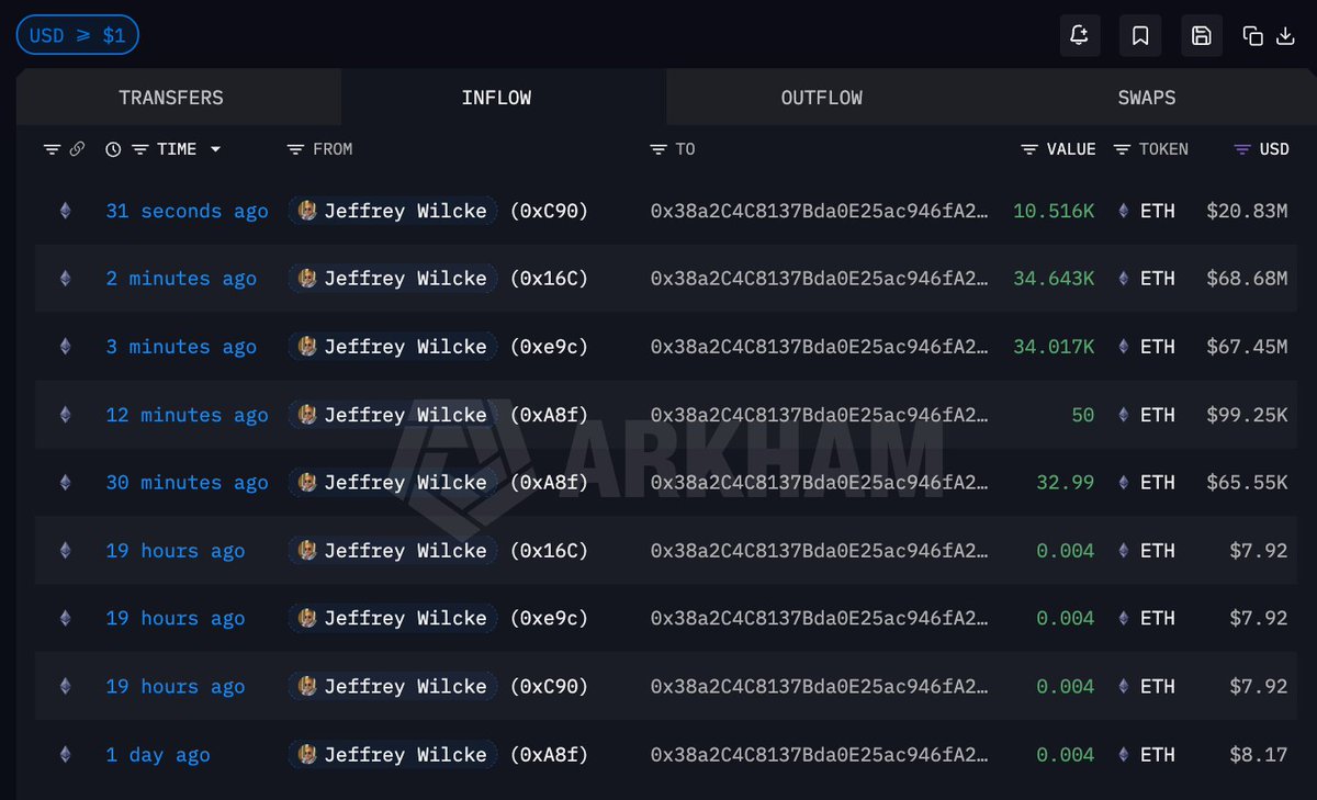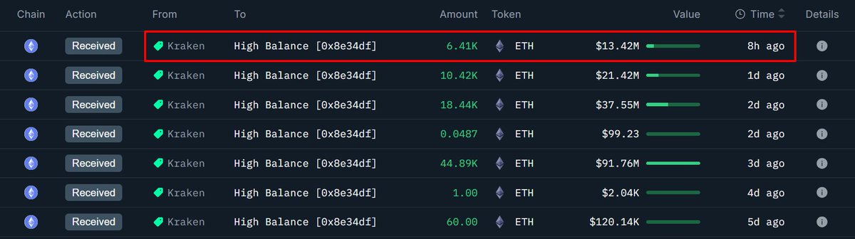 地址 0x8E3…64170 8 小时前又从 #Kraken 提出价值 3826 万美元的 ETH,昨天起已累计囤积 63324.36 枚,总价值 1.31 亿美元,平均提出价格 $2072.23