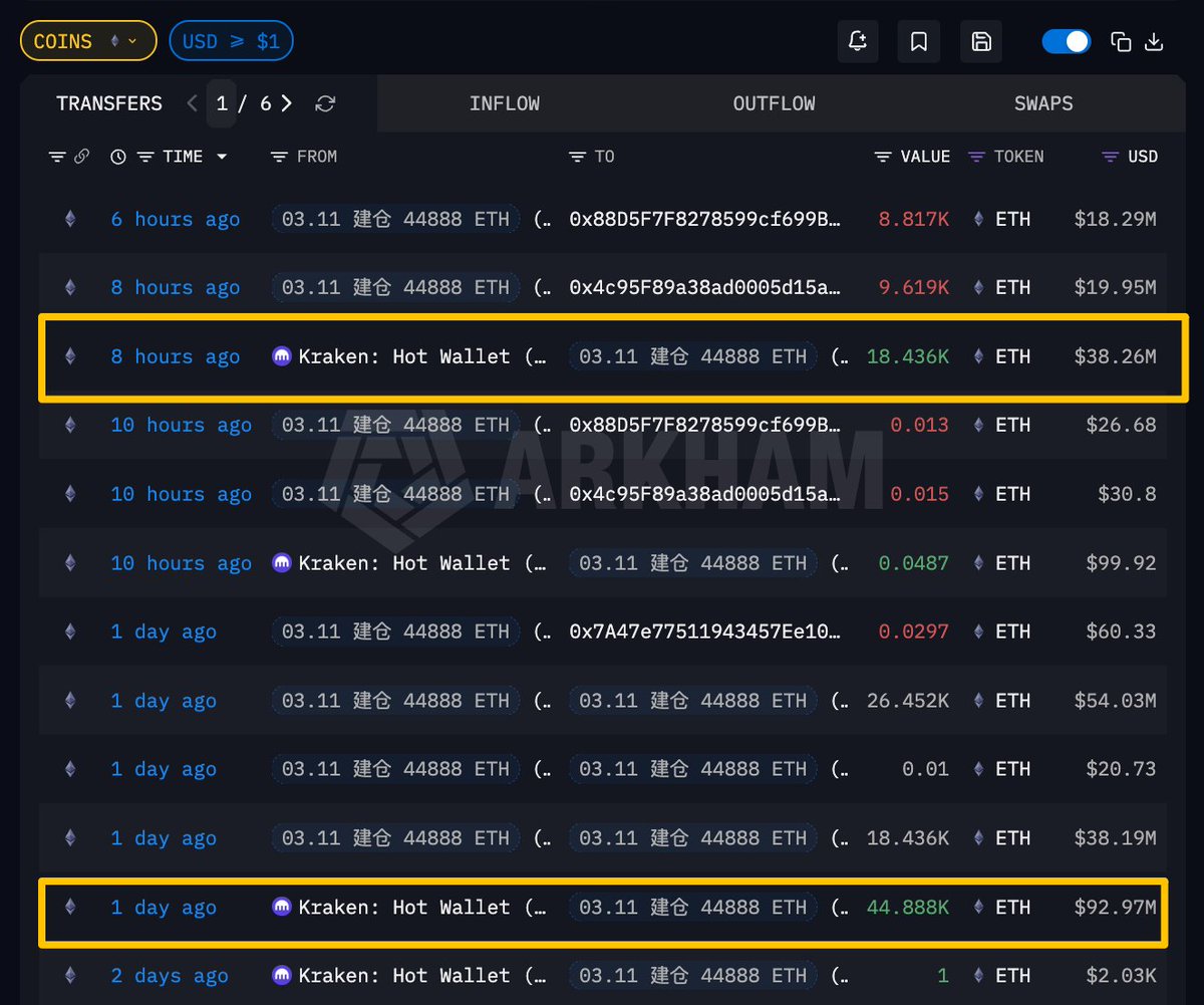10 小时前从 #Kraken 提出 44888 ETH,价值 9297 万美元,提出价格 $2071.1,现已转移至 2 个地址