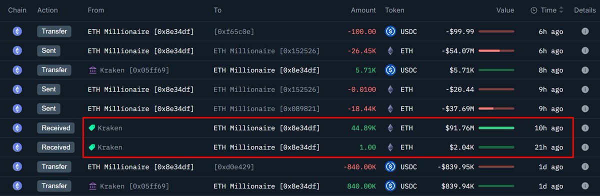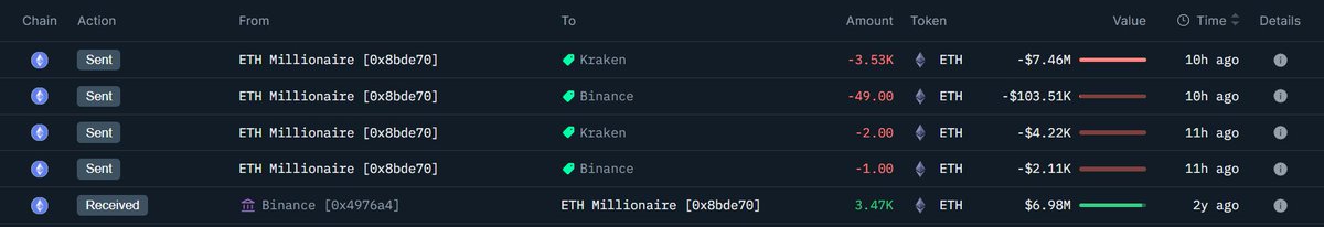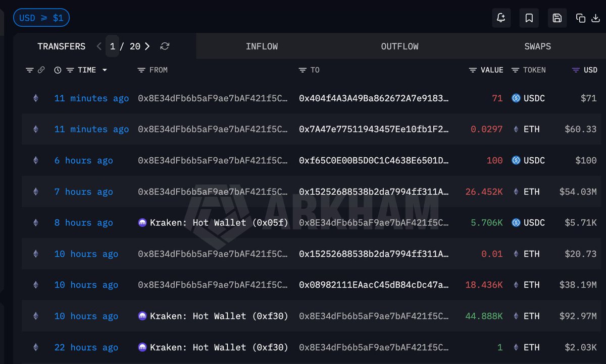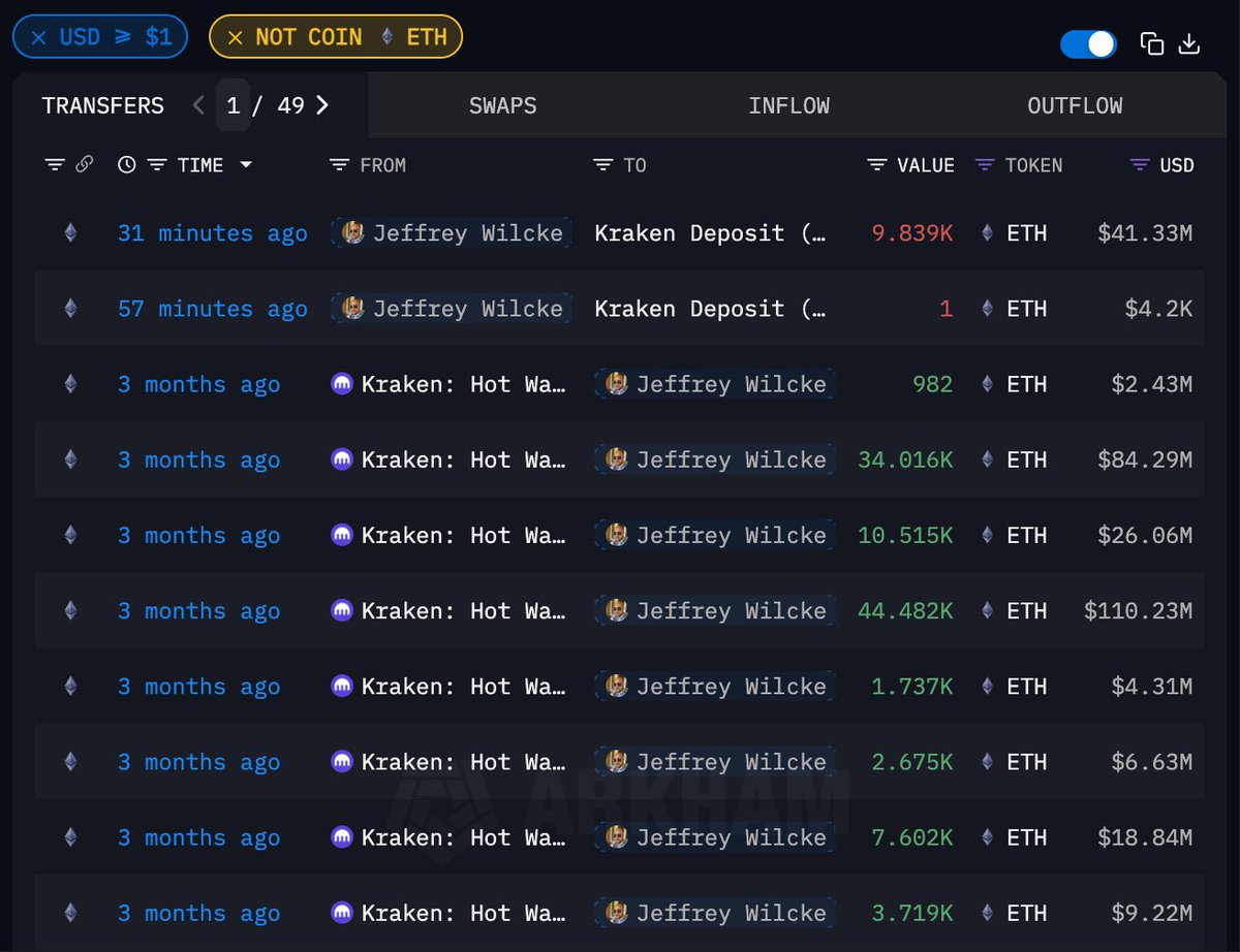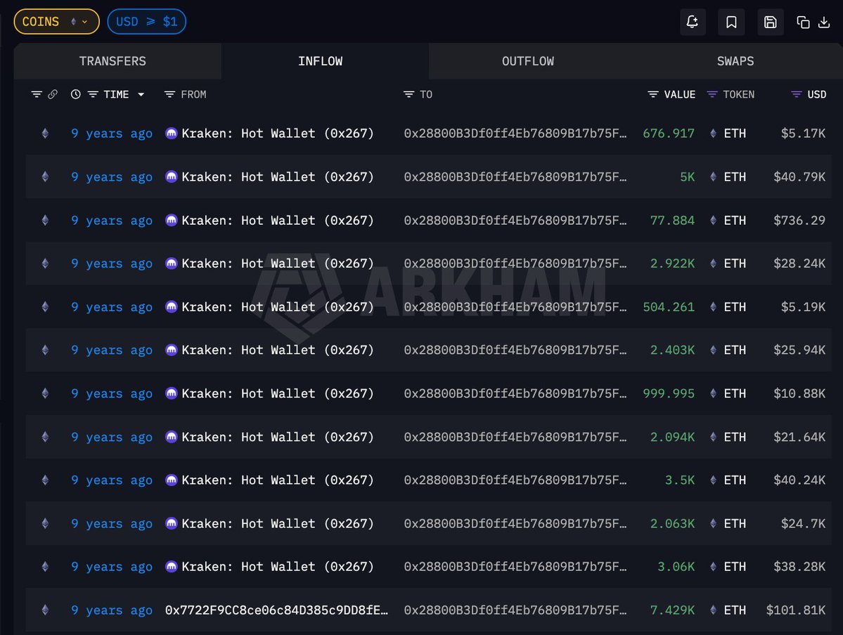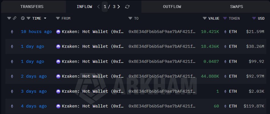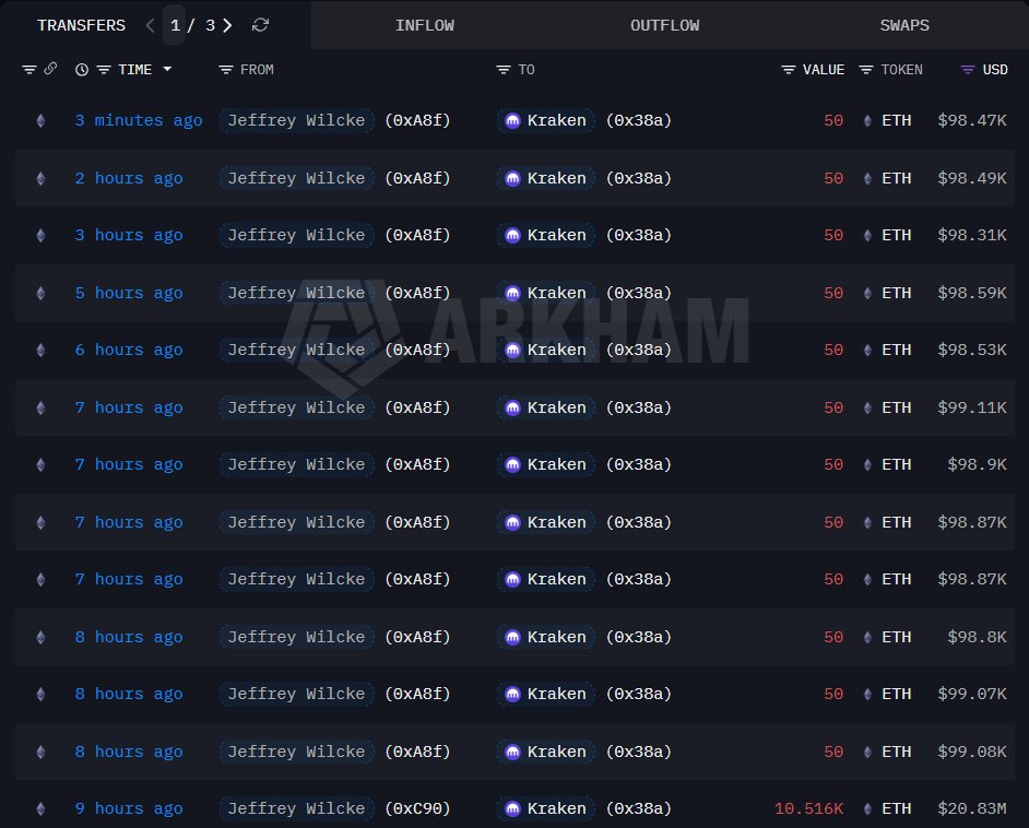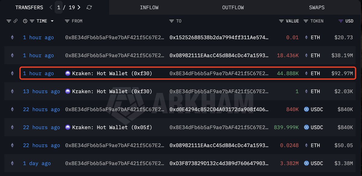 今年五月他将 105737 枚 ETH 充值进 Kraken 后分发至 8 个新地址;过去 1 小时其中一个地址开始将 ETH 再次转移至交易所,这次是打算高点卖出了吗?
