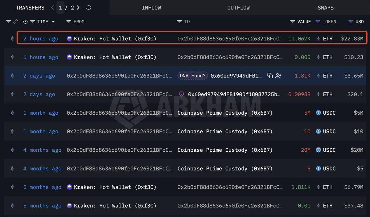 - 钱包"0x5e7"从#Kraken提取了2,050 $ETH(466万美元)
