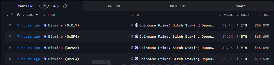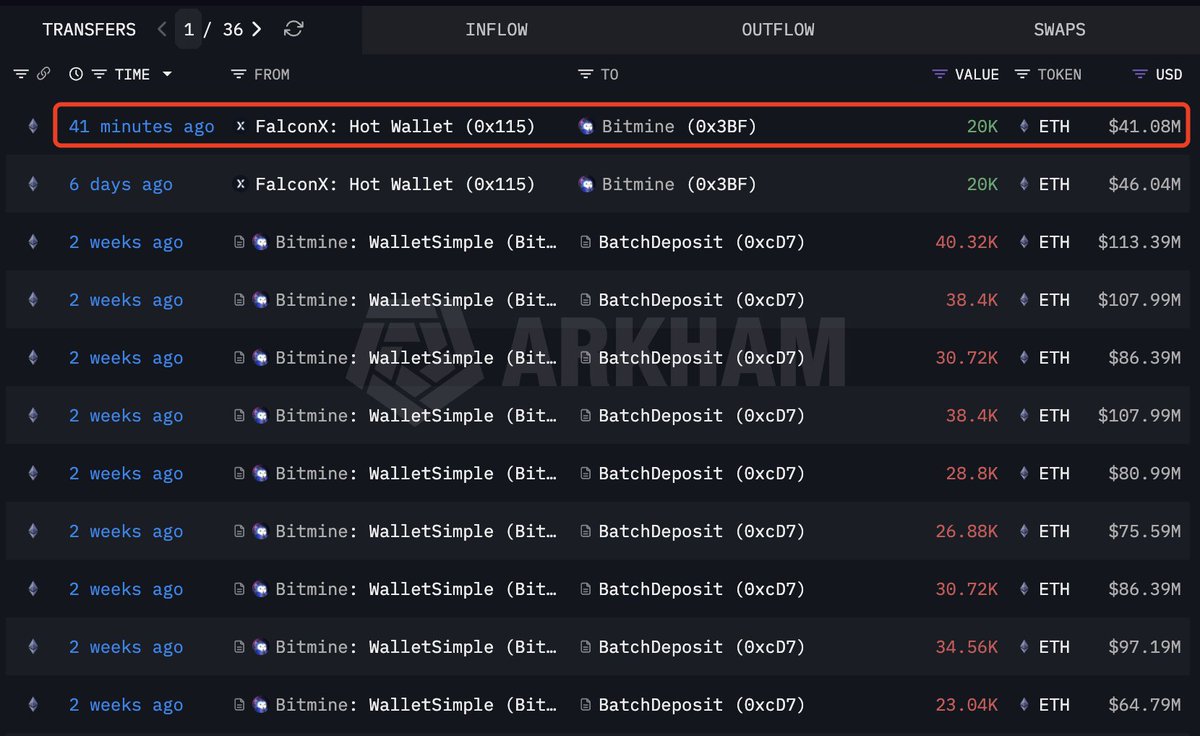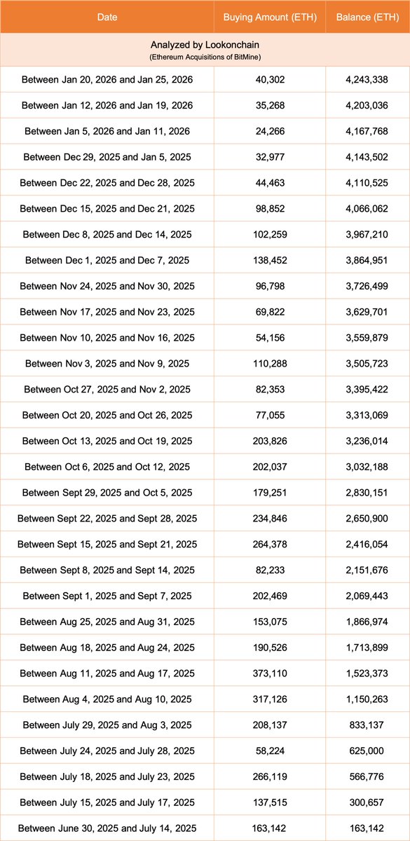 Tom Lee(@fundstrat)的#Bitmine上周又购买了44,463枚$ETH(1.3亿美元),目前持有4,110,525枚$ETH(120.2亿美元)。