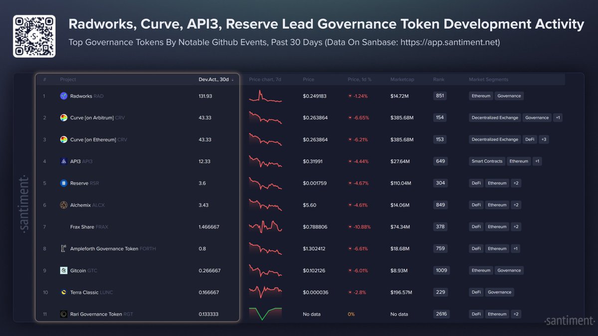 🧑💻 以下是按开发情况排名的顶级治理代币。这是一个全新的筛选器,我们将持续更新它们在github上的活动动态: