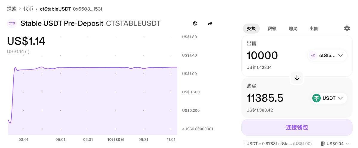 打进Stable的小伙伴可以原地收米了,最多能赚14%💰 有大户在Unswap加了ctStableUSDT/USDT的池子,目前10000 ctStableUSDT可以换11385.5 USDT,100万枚也能赚11万刀,免去资金锁定和空投波动造成的风险 目前最大的流动性池有千万级规模,散户如果愿意的话都能通过该渠道撤出,原地收米还是持币等空投,这几天看看大家会怎么选吧