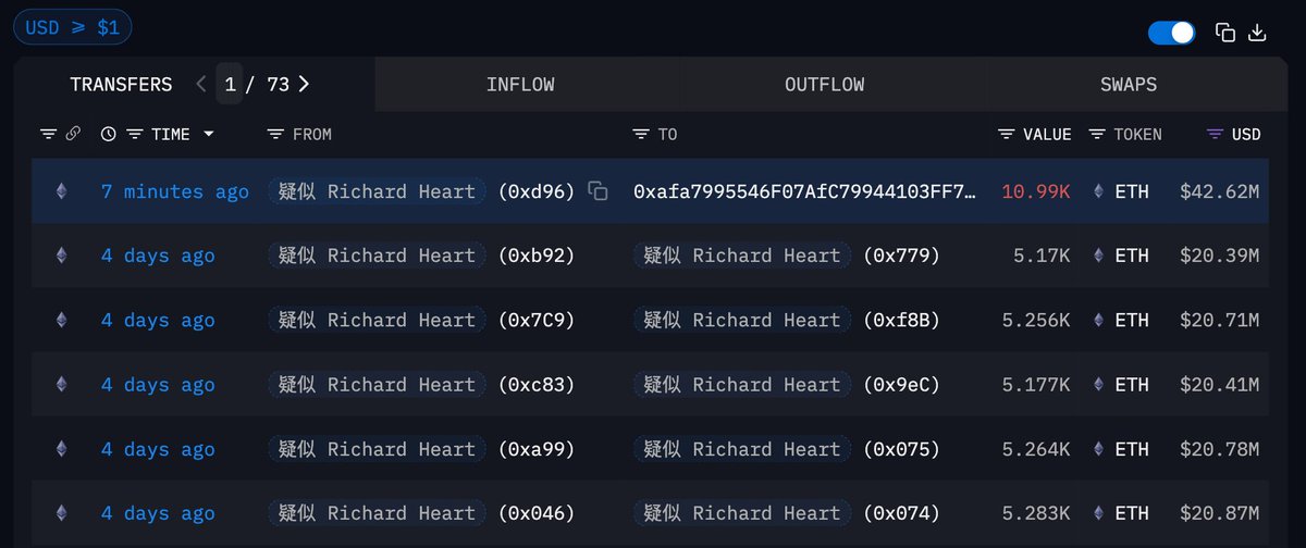 Richard Heart 关联地址时隔四天再次转移 $ETH 7 分钟前将 10990 枚 ETH 转移至新地址 0xafa...6C0d5(约 4262 万美元),接收地址目前暂无转移或卖出动作