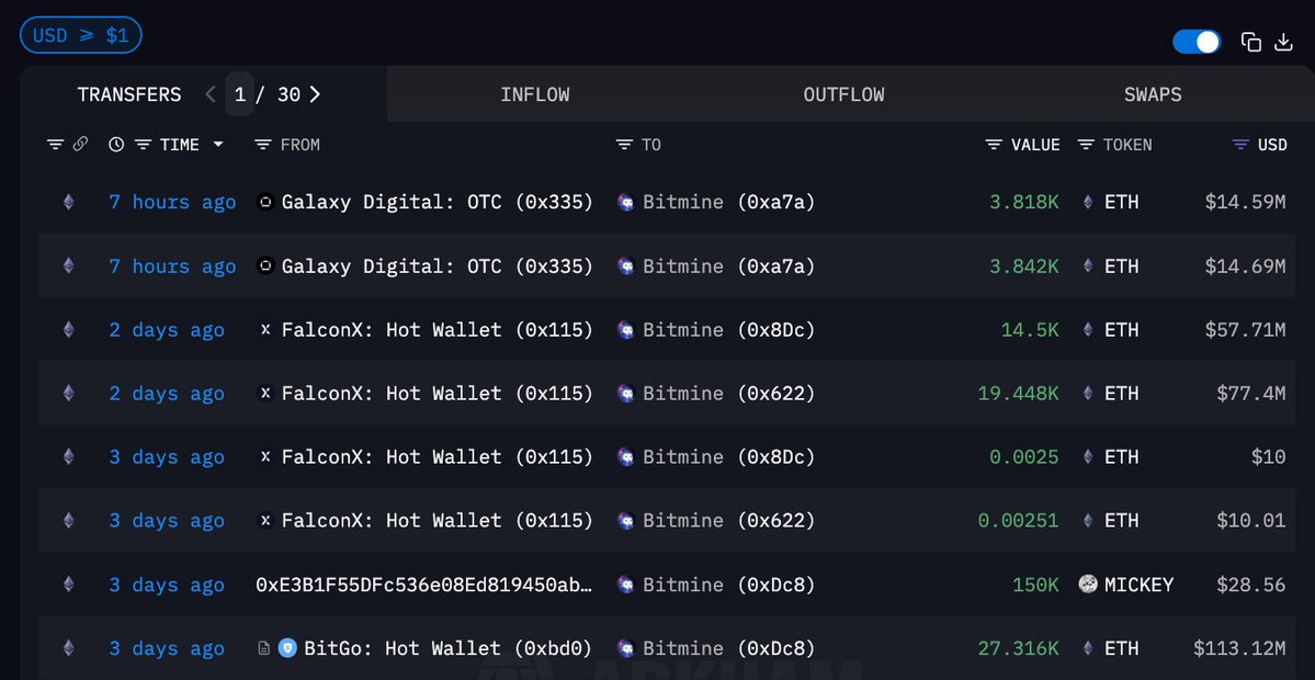 Bitmine 在 7 小时前再次受到 Galaxy Digital 转移的 7660 ETH,价值 2927 万美元,近三天累计从各渠道收到 ETH 68924.24 枚(约 2.77 亿美元)作为 $ETH 第一大持仓实体,Bitmine 目前已持有超 331 万枚 ETH,总价值高达 127.4 亿美元