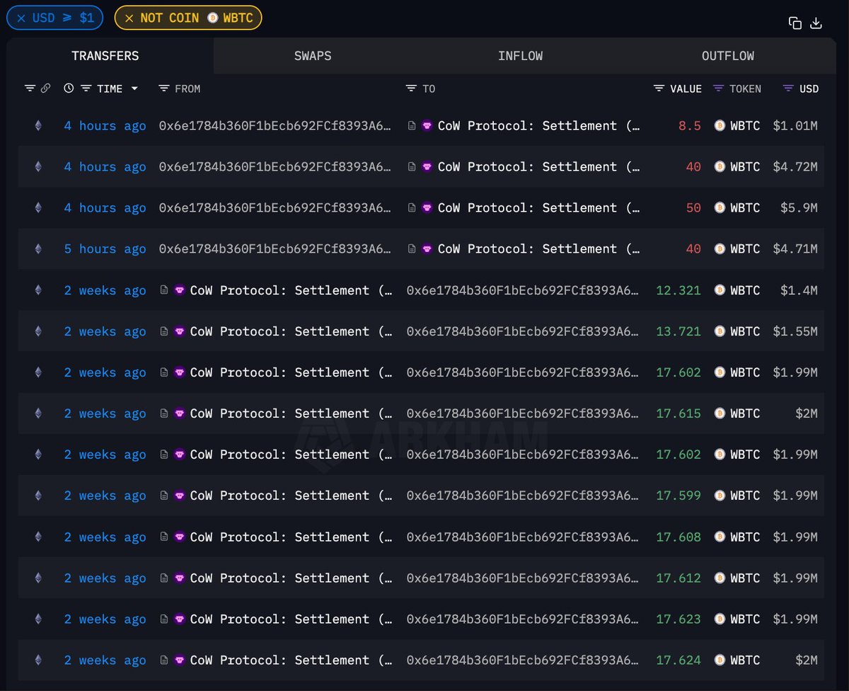 地址 0x6e1...90733 4 小时前在链上出售了 138.5 WBTC(1633 万美元)并获利 65.1 万美元;目前已将两周前建仓部分的 83% 抛售