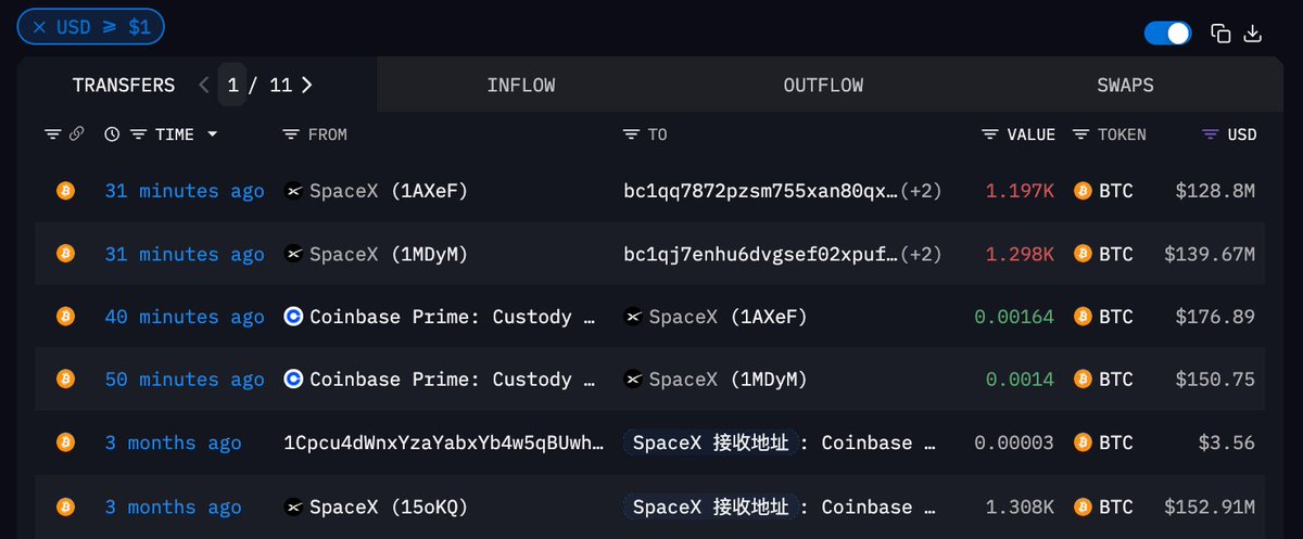 SpaceX 仅间隔三天再次转出 1215 BTC,价值 1.33 亿美元 BTW:三天前转移的价值 2.68 亿美元的 $BTC 也暂时没有动静,转出意图尚不明确