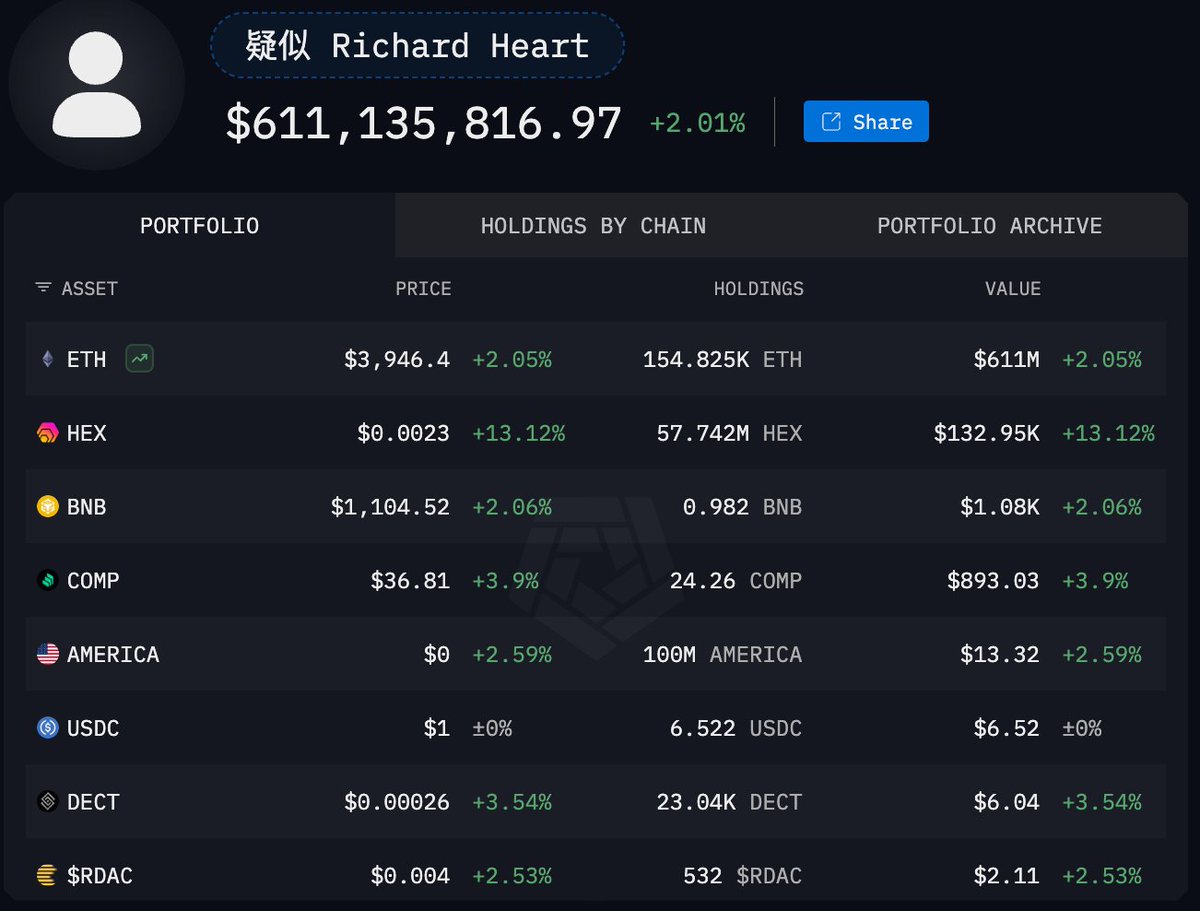 沉睡两年的 Richard Heart 关联地址(HEX 与 PulseChain 创始人)正在疯狂整理钱包,过去 1 小时再次将 $ETH 分发至 10 个新地址 目前他在链上共计持有 154825 ETH,平均成本 $$3,779,总价值 6.11 亿美元,当前浮盈 2579 万美元,暂时不确定本次转移代币和分仓的意图