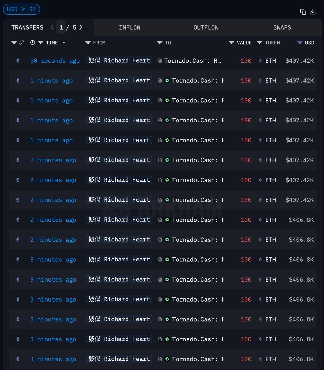 既 10.24 将 10,900 ETH 转入龙卷风后,疑似 Richard Heart(HEX 与 PulseChain 创始人) 15 分钟前再次将 11558 $ETH 转入新地址,开始分批转移至 Tornado Cash 💡 目前接收地址已转出 7300 枚 ETH,价值 2,956 万美元,每次都是上涨的时候搞这出啊