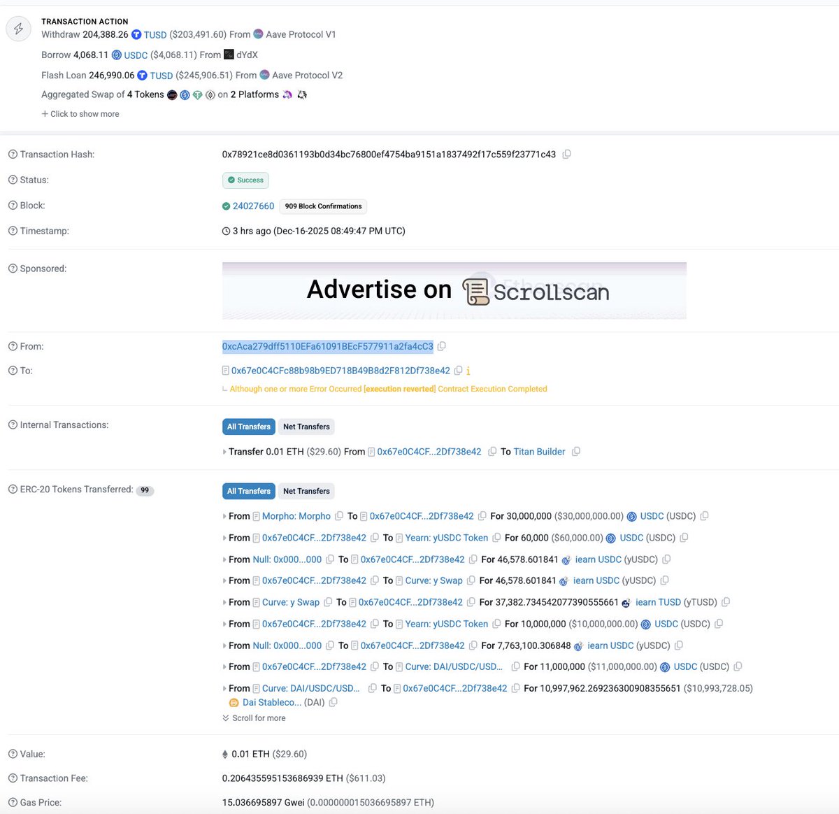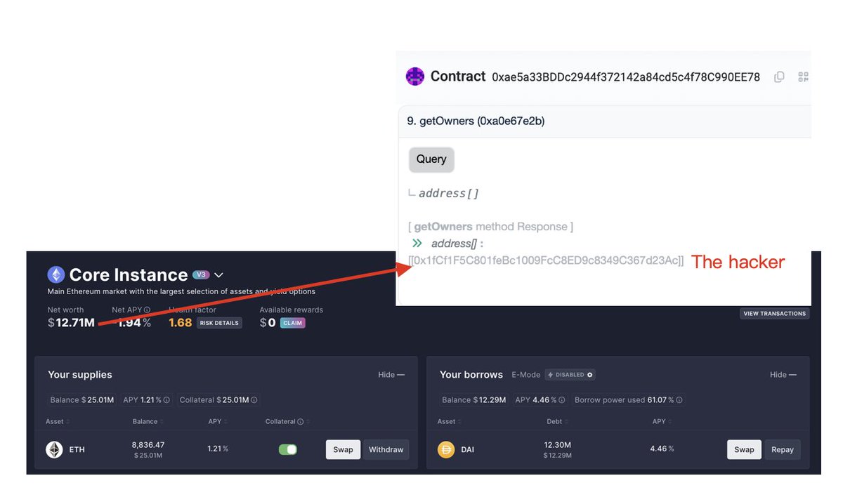 盗取者还控制了受害者的多重签名钱包,该钱包在Aave上维持着一个杠杆多头头寸(存入$25M ETH,借入$12.3M DAI)。