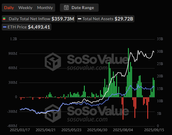 重大消息:ETFs刚刚流入$359.7M。连续第5天的需求,由BLACKROCK引领。🚀
