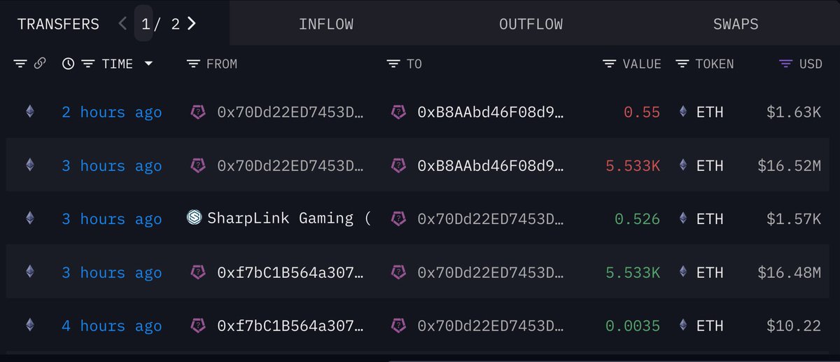 3小时前,#Sharplink_Gaming (#SBET) 转移了5,533 $ETH (~$16.48M) 到 #Galaxy_Digital