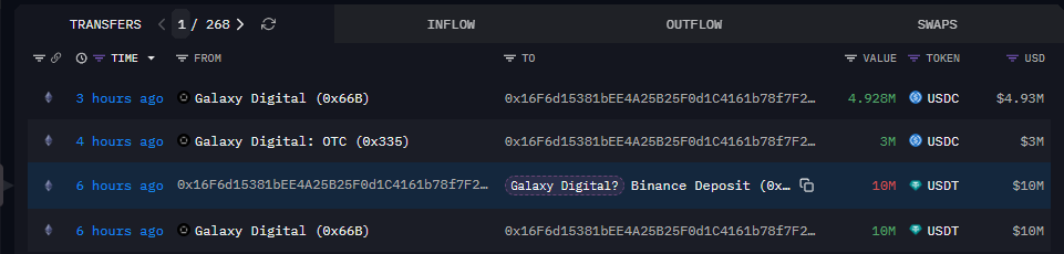 24小时内,一个钱包(可能是#Galaxy_Digital - MM of $ASTER)向#Binance存入了总计610万$ASTER(约1208万美元)。