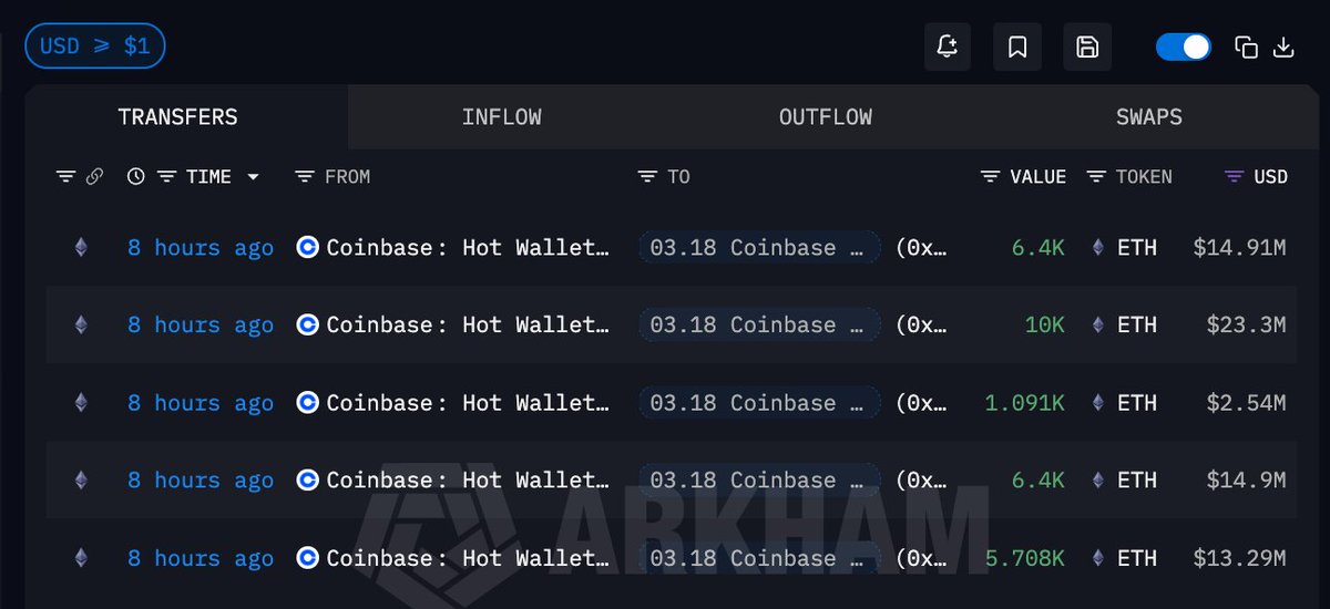 - 钱包"0x13A"从#Coinbase提取了10,000 $ETH(2274万美元)
