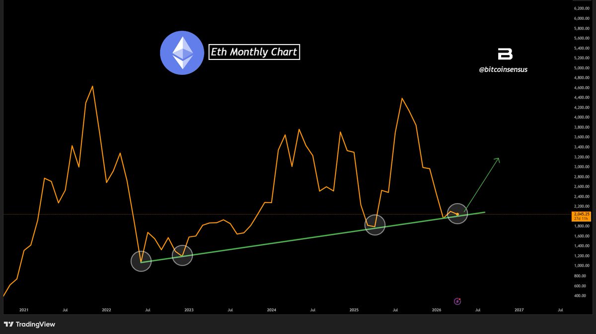 以太坊的月度图表再次与同一上升趋势线互动,该趋势线自2022年中期以来支撑了每一个主要更高的低点。