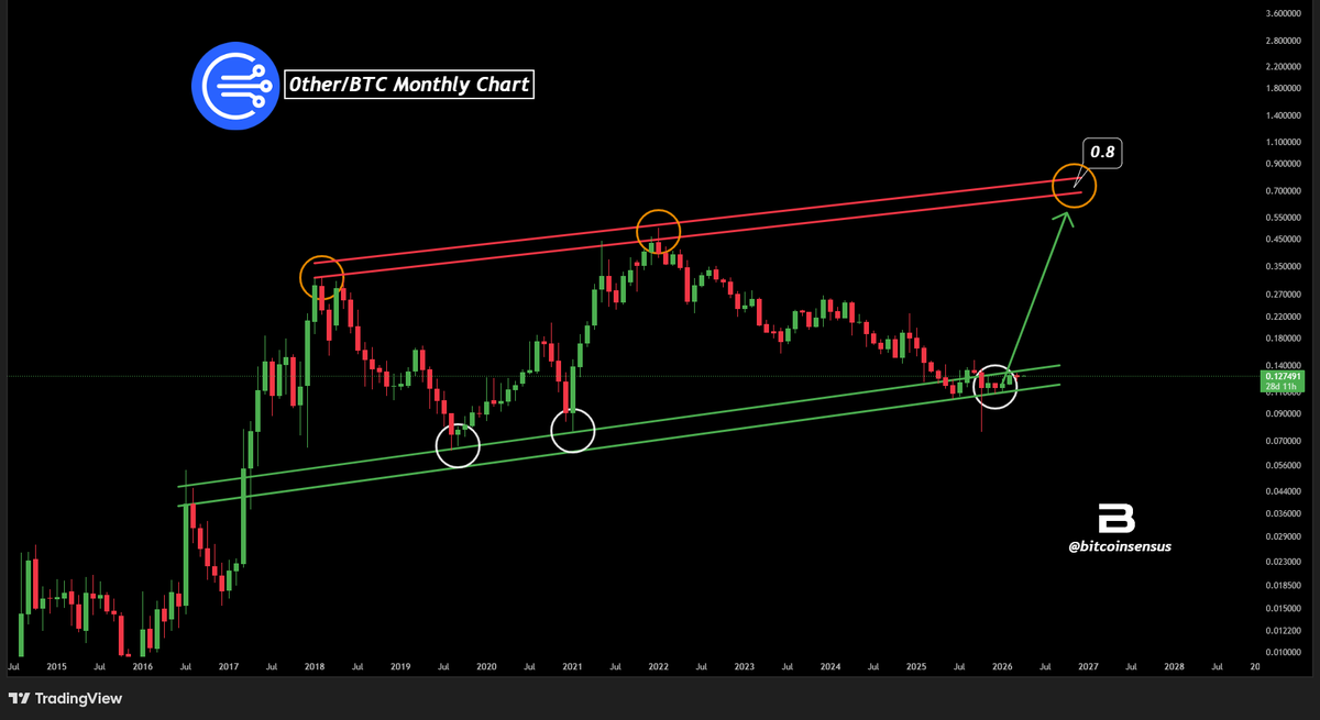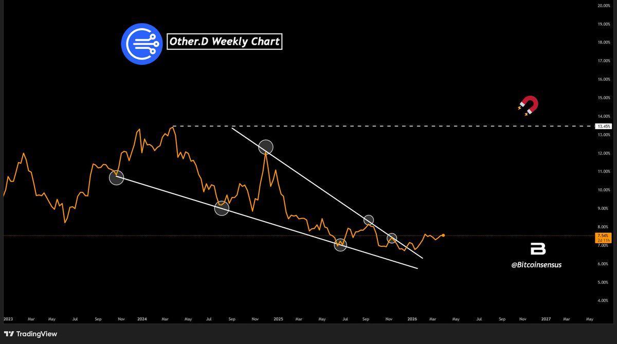 Altcoin dominance (Others.D) 多年来在一个清晰的下降通道内逐步走低,每次反弹都在上轨遇阻。