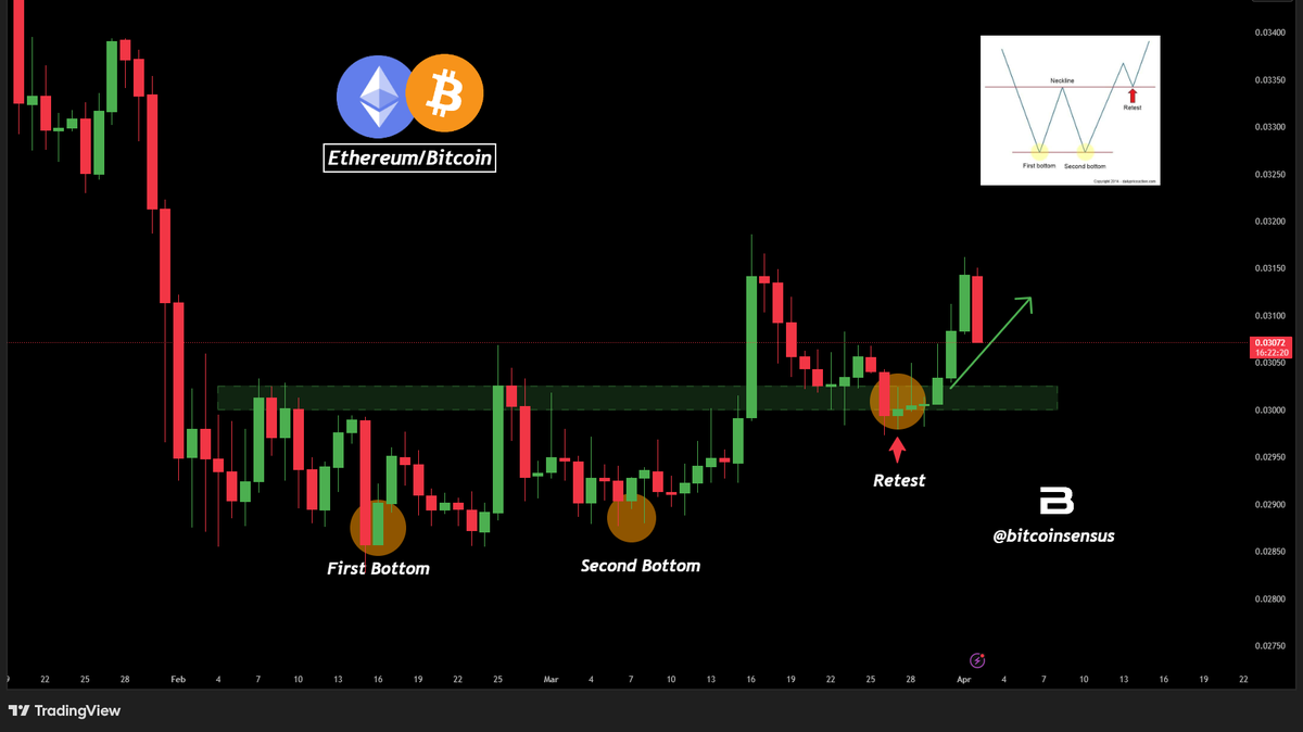 ETH/BTC在双底突破后显示出建设性的重新测试,价格从前阻力区域反弹并试图将其作为支撑位。