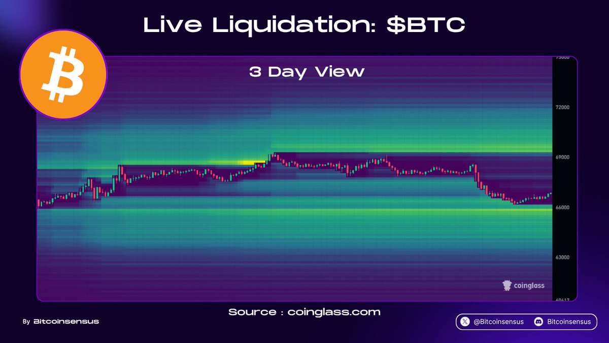 比特币的3天清算热图显示价格在两个显著的流动性带之间交易,当前水平下方有一个密集的区域,上方还有另一个聚集区。