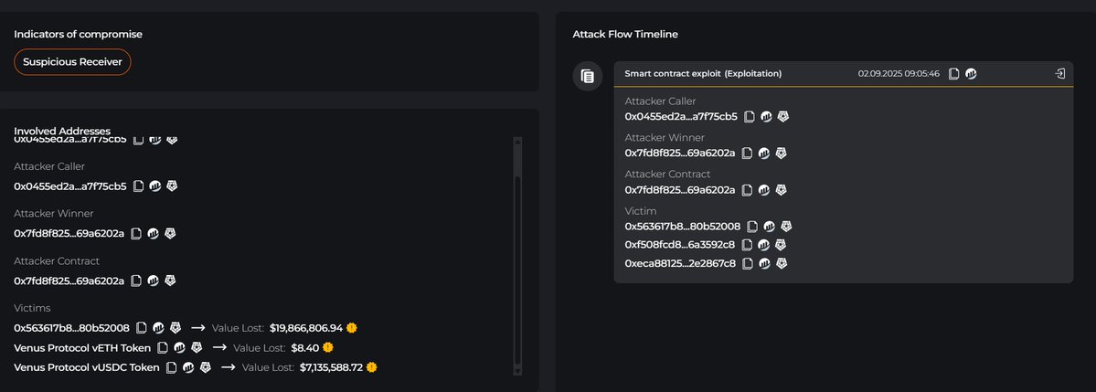 🚨警报🚨检测到涉及@VenusProtocol用户的2700万美元可疑交易发生在#BNBChain上 该用户在不知情的情况下批准了恶意交易,授予了代币权限导致2700万美元数字资产损失。被盗资金目前存放在攻击者的合约中尚未被兑换。想让你的公司远离我们的警报雷达?了解如何保护你的资产:Book a Demo