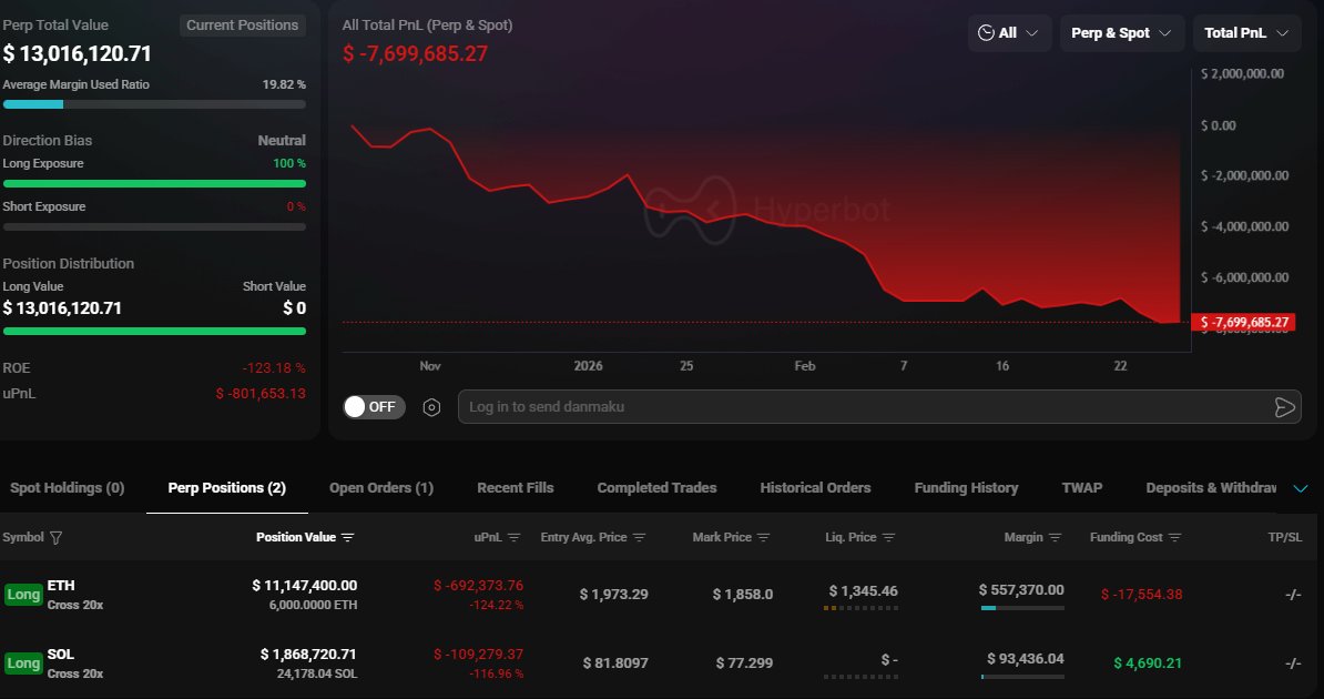 Machi的(@machibigbrother)在#HyperLiquid上的利润遭受了巨大打击。就在13天前,Machi还赚了$44.84M,现在只剩$6M,并且在$ETH(15倍)和$XPL(5倍)的多头头寸上还有$13.9M的浮动亏损。