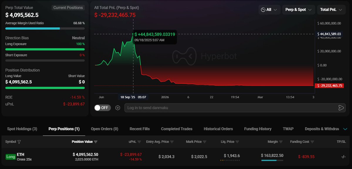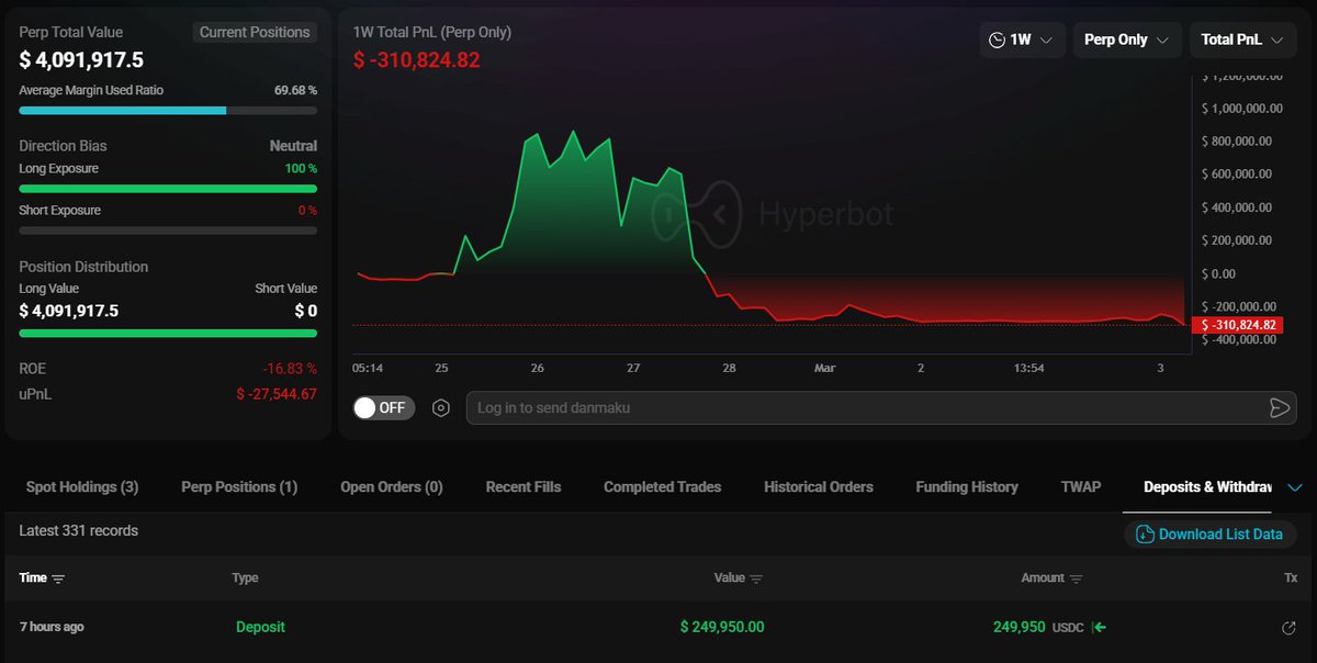 Machi @machibigbrother 又存入了25万美元 $USDC 到 #HyperLiquid 并增加了他的 $ETH (25倍) 多头仓位。Machi在6个月内损失了约7408万美元,从盈利超过4480万美元到亏损超过2923万美元。