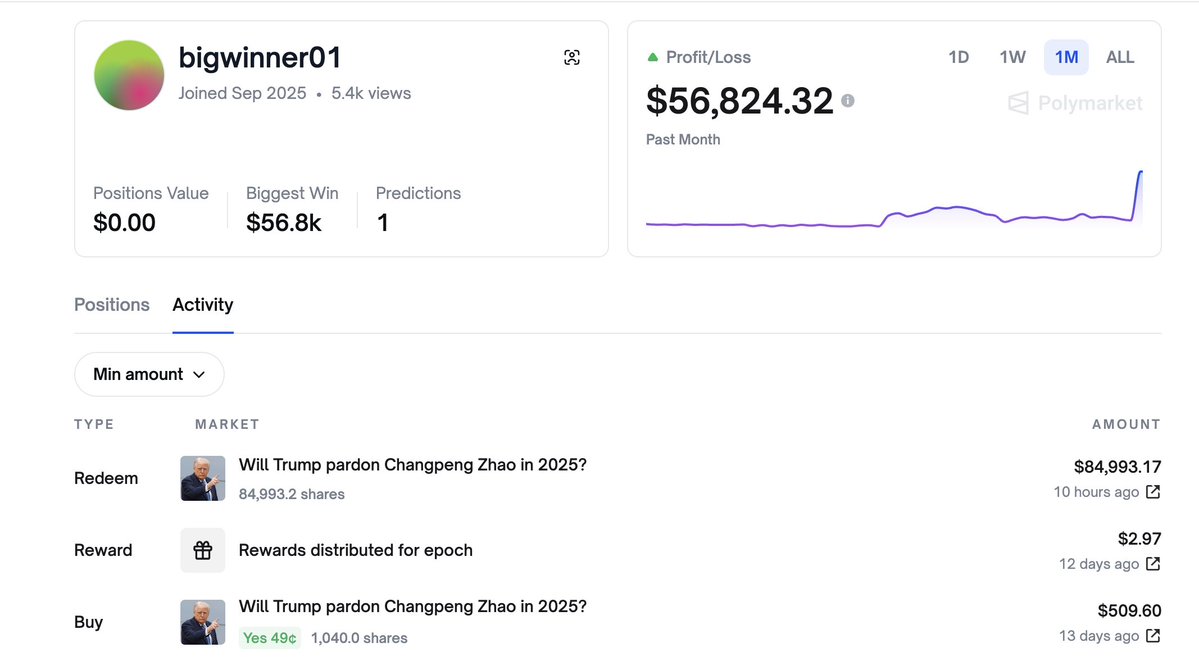 Garrett(@GarrettBullish) 早期在#Polymarket 上下注#Trump 会赦免赵长鹏——赚取了5.68万美元的利润。