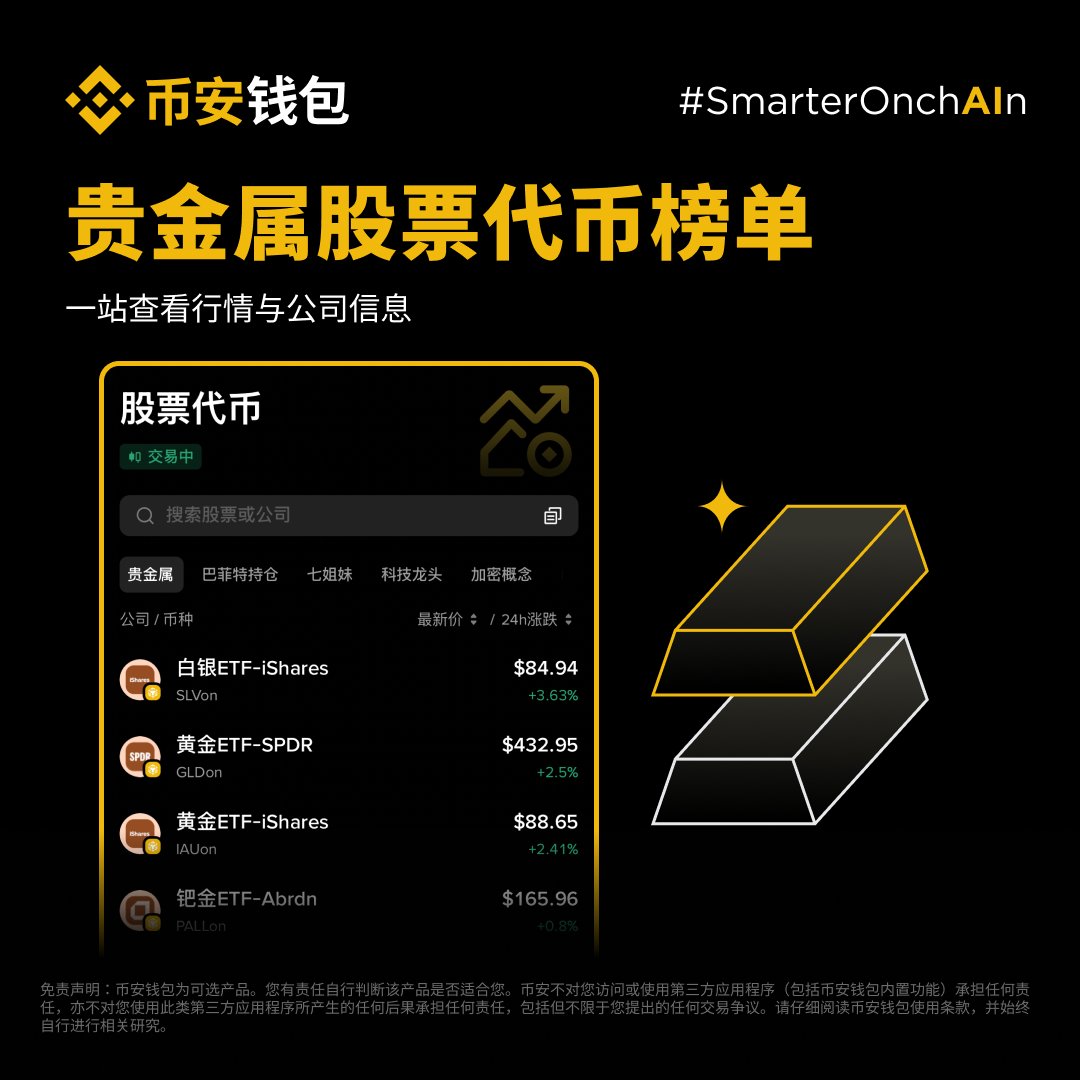 在 #币安钱包 股票代币板块,用户可以使用 USDT / USDC 直接交易第三方平台发行的贵金属股票代币🙋