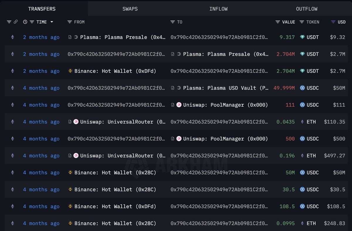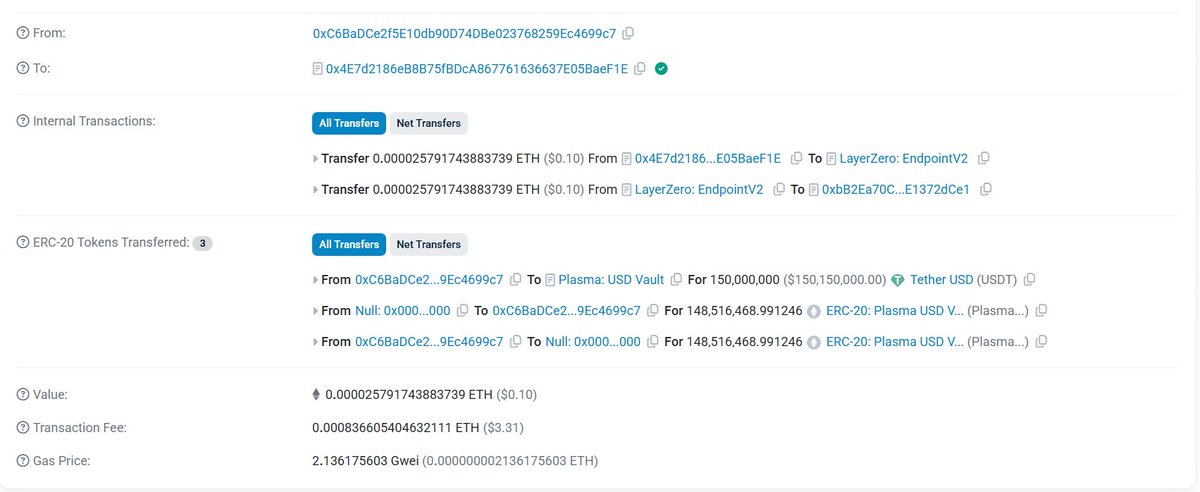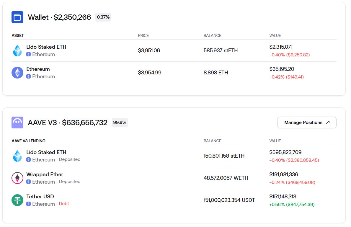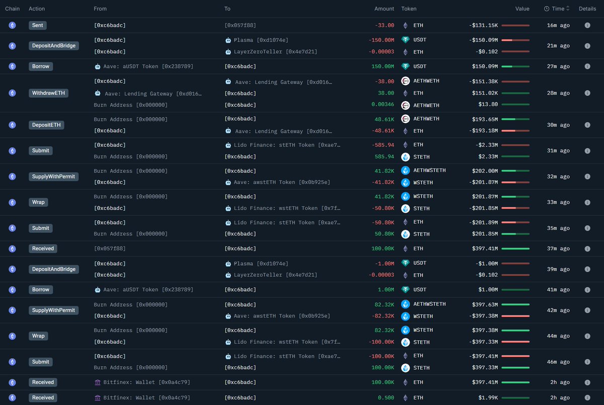 2个与BitFinex相关的钱包向Aave V3提供了200,000 ETH,价值790.43M美元。然后他们借了151M USDT并将其转移到Plasma Vault。地址:0xc6badce2f5e10db90d74dbe023768259ec4699c7 数据来自nansen_ai