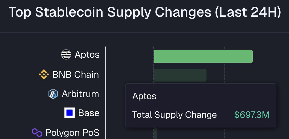 🚨APTOS在稳定币流动中领先! #APTOS上的稳定币活动达到了$528M,而以太坊的记录是$138M — 这使得Aptos今天的稳定币交易量高出约73%。